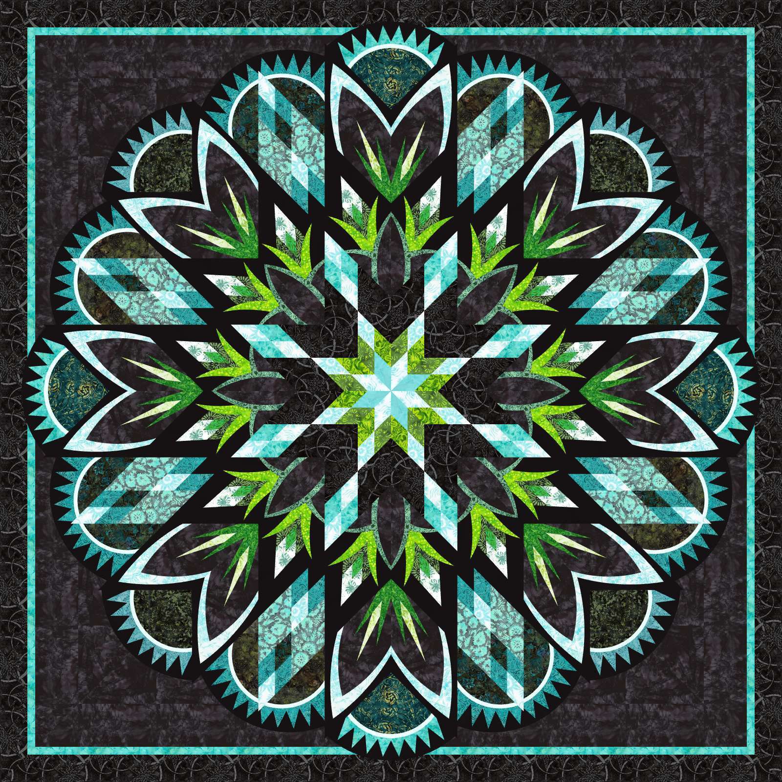 Step into a world of radiant color and mesmerizing design with Bioluminescence, the newest addition to the Kaleidoscope Mixer series designed by Judy and Bradley Niemeyer. This show-stopping quilt glows with swirling teals, greens, and yellows that shimmer like underwater light, contrasted against striking black and white fabrics for a dramatic, luminous effect. The cover sample, showcases fabrics from the Timeless Treasures’ Valley Blossoms collection, designed by Judy and Judel Niemeyer.