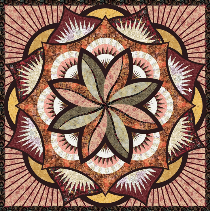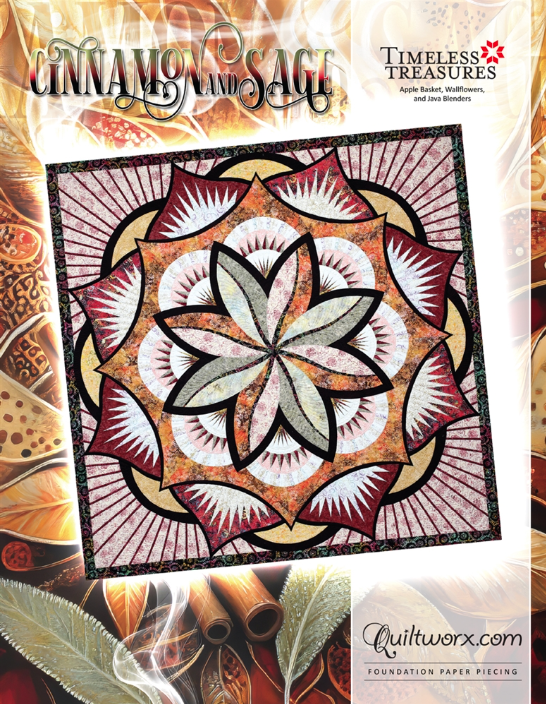Wrap yourself in the warmth of fall with Cinnamon and Sage, a stunning quilt pattern from Judy and Bradley Niemeyer, part of the beloved Hosta Medallion Mixer series. This 100″ x 100″ quilt radiates the rich, spicy hues of the season—think cinnamon sticks, steeping teas, and crisp leaves underfoot. The cover photograph, designed by Judel Neimeyer, features fabrics from the Apple Basket collection by Timeless Treasures: deep burgundies, glowing oranges, earthy sage greens, and dramatic contrasts of black and light fabrics.
