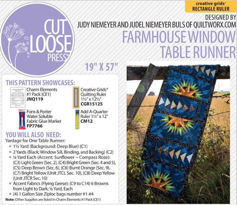 Farmhouse Window Table Runner designed by QuiltWorx is a great way to learn some of Judy Niemeyer’s techniques. This generous-sized table runner measures 19 x 57 inches so it is a perfect choice when you want to add a touch of color and class to an island or bar in your kitchen! Quiltworx Charm Elements Pack #1 (JNQ119P) is required.