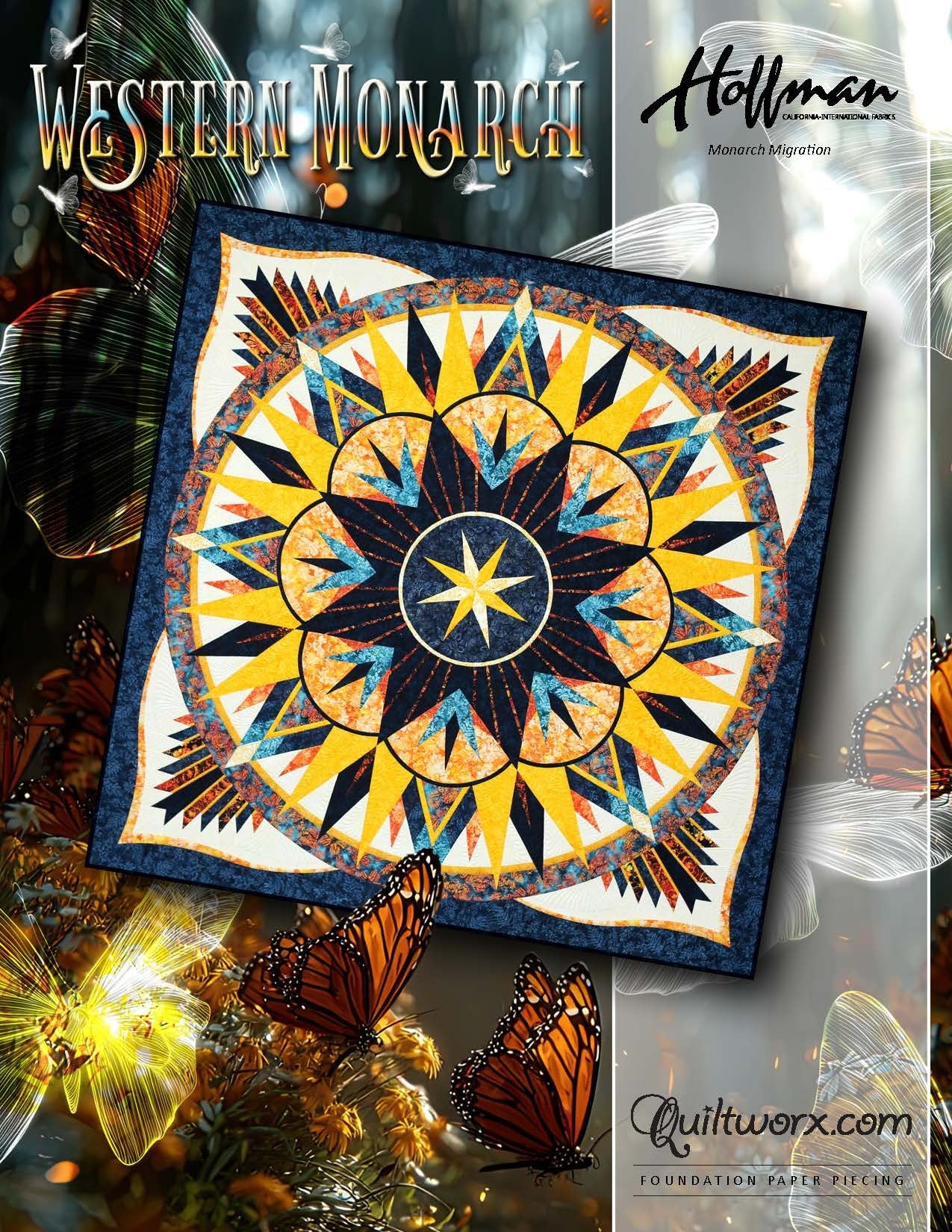 The Western Monarch is the newest release in the celebrated Congo Star Mixer series, designed by Judy and Bradley Niemeyer. This stunning quilt captures the magic of monarch migrations at twilight, with a colorway created by Judel Niemeyer in Quiltster using fabrics from the Monarch Migrations collection by Hoffman Fabrics.
